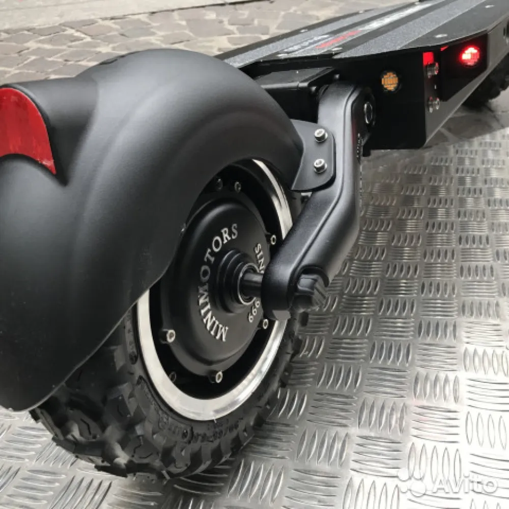 Электросамокат имеет два мотор-колеса, мощность каждого по 2700 Вт. Максимальная скорость 85 км/ч, ее можно сравнить со скоростью автомобиля. При желании спокойного передвижения и в целях экономии заряда, можно легко отключить один мотор. Рама выполнена из высокопрочного и легкого алюминия. Складывается, нет проблем с местом для хранения.
